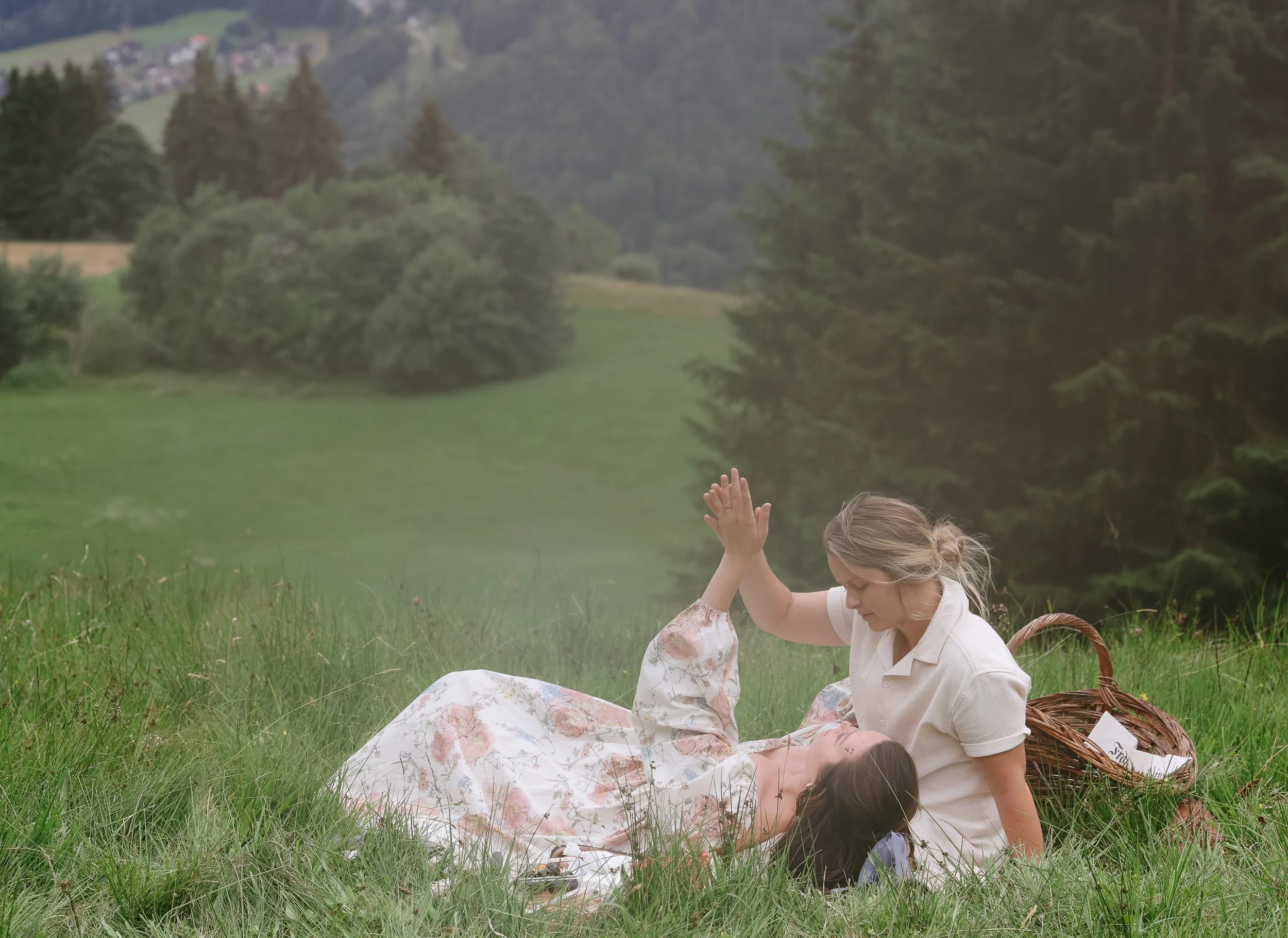 Lauterbrunnen is a dream destination. Vast and expansive, with the town stretched below and snow dusted peaks in the distance. It’s one of those places that feels almost unreal. Quiet and breathtaking. Ashley and Caroline started with an intimate picnic, the air calm. They stayed close, moved slowly, and shared a kind of natural comfort that’s felt more than explained. They communicate love in the sweetest of ways. Quiet check-ins, brushing hair from each other’s faces, little laughs, an ease that feels deeply familiar. It was so easy to photograph them.
